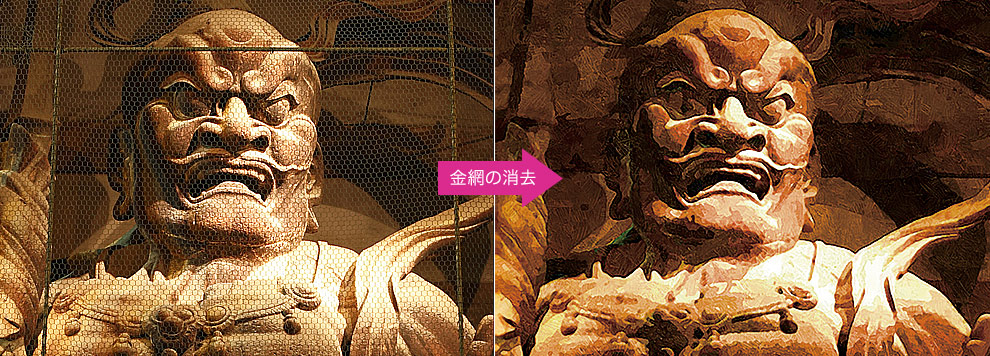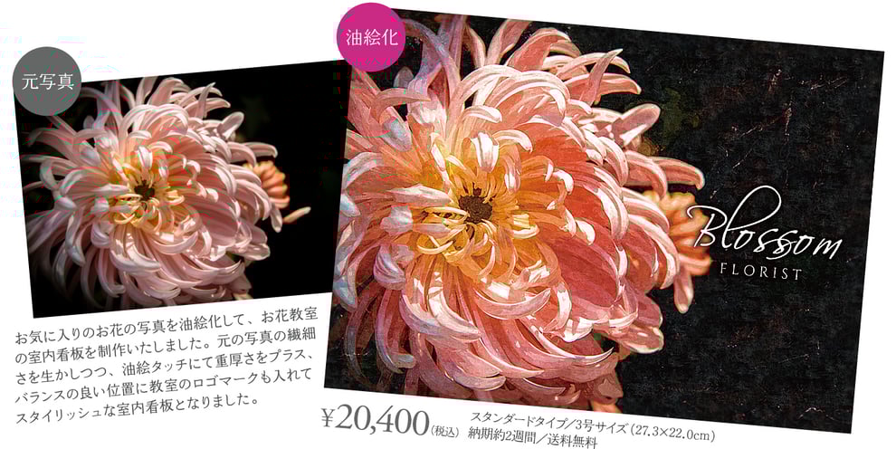 写真が持つオリジナルの雰囲気を残しながら、専任オペレータによるデジタル加筆をおこない、迫力のある油絵化を実現しています。