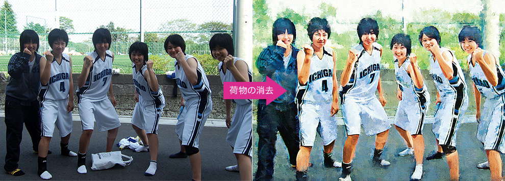 デジタル油絵の制作には、アパレル業界や化粧品業界をはじめ、自動車関連、宝飾品関連など、極めて難しい画像処理の経験が豊富なプロのオペレーターが携わっておりますので、例えば、構図や色調に不良部分がある場合には、よりよい見栄えを目指して調整させていただいたり、写真の背景が殺風景な場合などには、その写真の持つ意味をよく理解した上で適切な背景に差し替えて、より魅力的な絵画作品とさせていただいております。