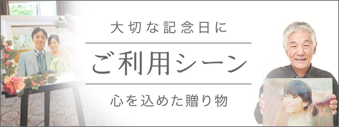 お客さまからご注文いただいたデジタル油絵の制作事例です。弊社では、元写真の良さを保持しつつ、さらにより良い表現となるよう工夫を凝らし、何度も丁寧に調整を繰り返して完成品を仕上げております。表情が生き生きと映えるよう調整したり、写り込んでいる不要な物を消去したり、印象的な絵画になるよう背景を自然に合成したり、文字入れや小顔効果にいたるまで、かゆいところに手が届くようなプラスアルファの対応をいたしております。ぜひ他社との違いをご覧いただき、オーダーの際のご参考になさってください。