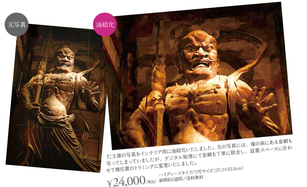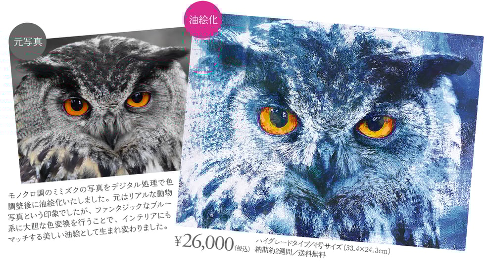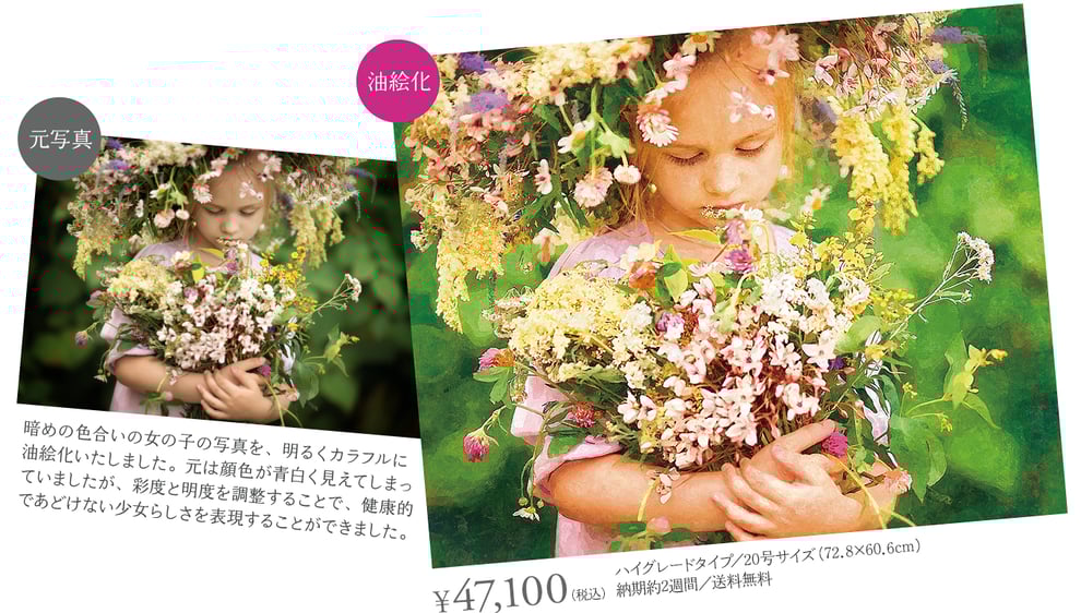 スマホの中に大事に保存しているお気に入りの画像をサイトから送信いただくだけで、キャンバスに印刷された本物の油絵そっくりの美麗なデジタル油絵をお届けいたします。「亡くなってしまったペットの写真がスマホで撮ったピンぼけのものしかない」「ウエルカムボードにしたいので美麗に小顔にしてほしい」「大切な写真にガラクタがごちゃごちゃ映り込んでしまっている」等の写真に関するお困りごとも、シビアな広告業界の画像加工を日夜出がけているプロの技術で解決し、お客様の大切なお写真を美しい油絵作品によみがえらせます。