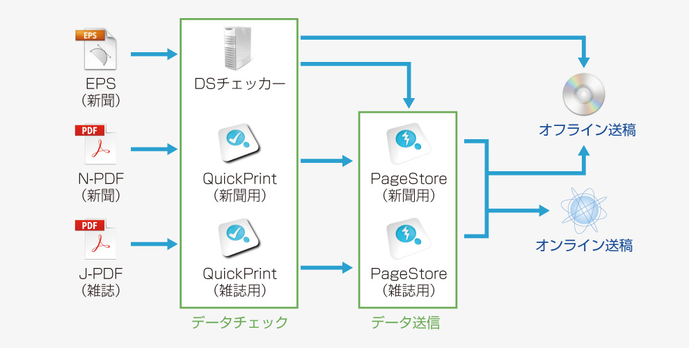 N-PDF(新聞)、J-PDF(雑誌)データのチェック及び、インターネットを利用したセキュアなネットワークを通じて送稿するためのものです。弊社ではそのシステムを導入・構築し、各種ご要望への対応が可能になっております。